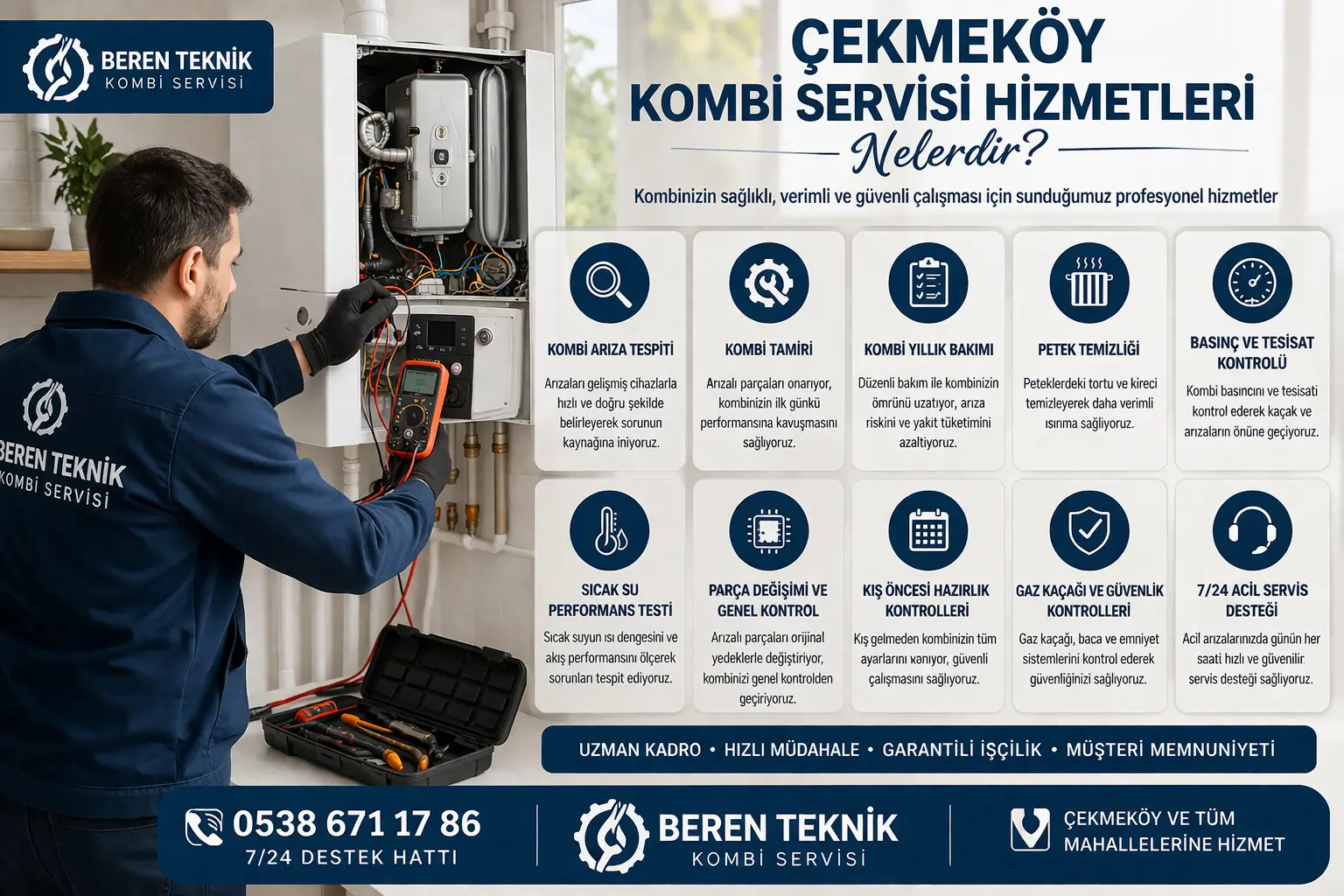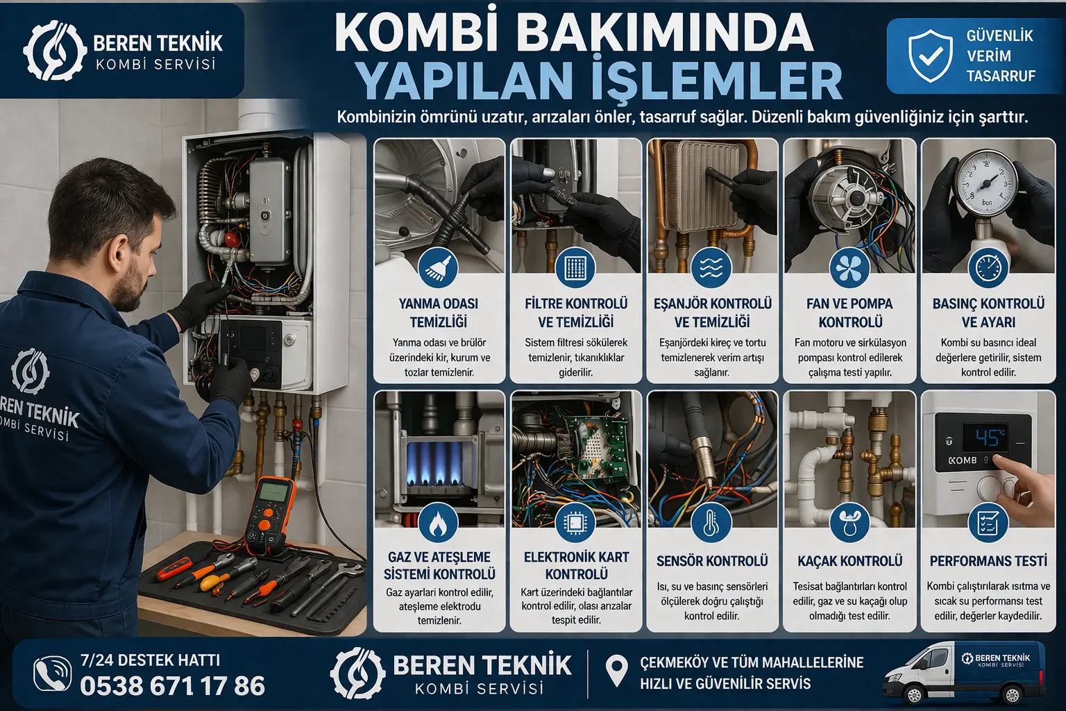 Çekmeköy kombi servisi kapsamında sunulan hizmetler yalnızca arıza onarımı ile sınırlı değildir. Kombinin güvenli, verimli ve uzun ömürlü kullanılması için birçok teknik işlem bir arada değerlendirilmektedir. Bu işlemler genel olarak şu başlıklarda toplanabilir: