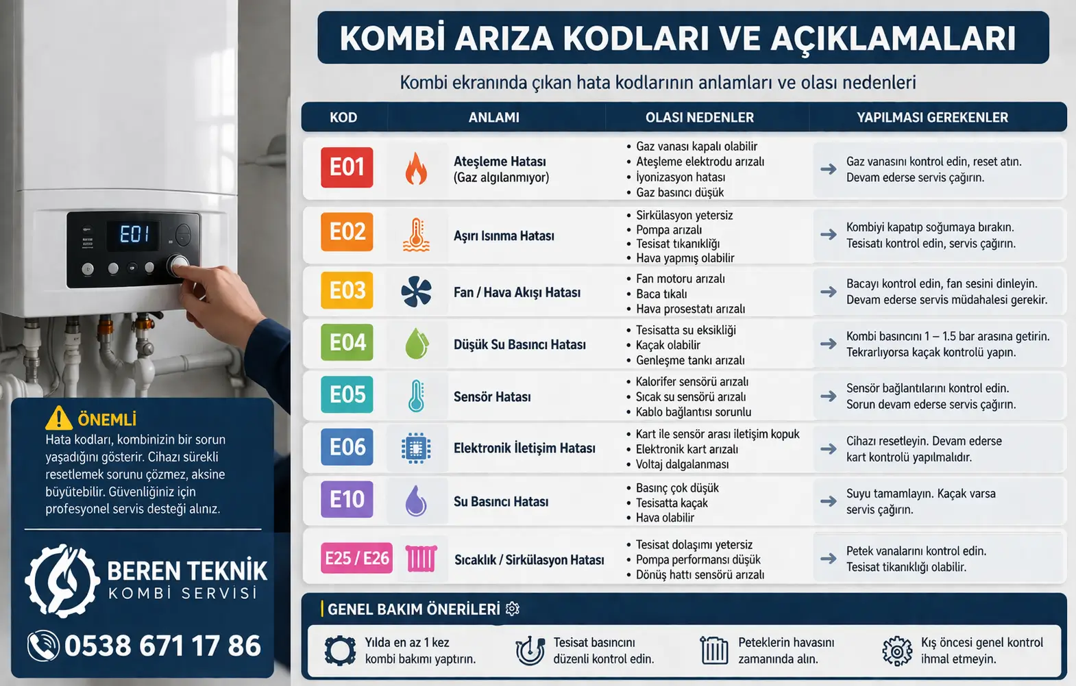 Kombi ekranında görülen hata kodları, cihazın hangi alanda sorun yaşadığını anlamaya yardımcı olur. Her markada kodların anlamı farklılık gösterebilse de genel olarak kullanıcıların sık karşılaştığı bazı hata türleri bulunmaktadır. Detaylı kodlar aşşağıdaki görselde belirtilmiştir.
