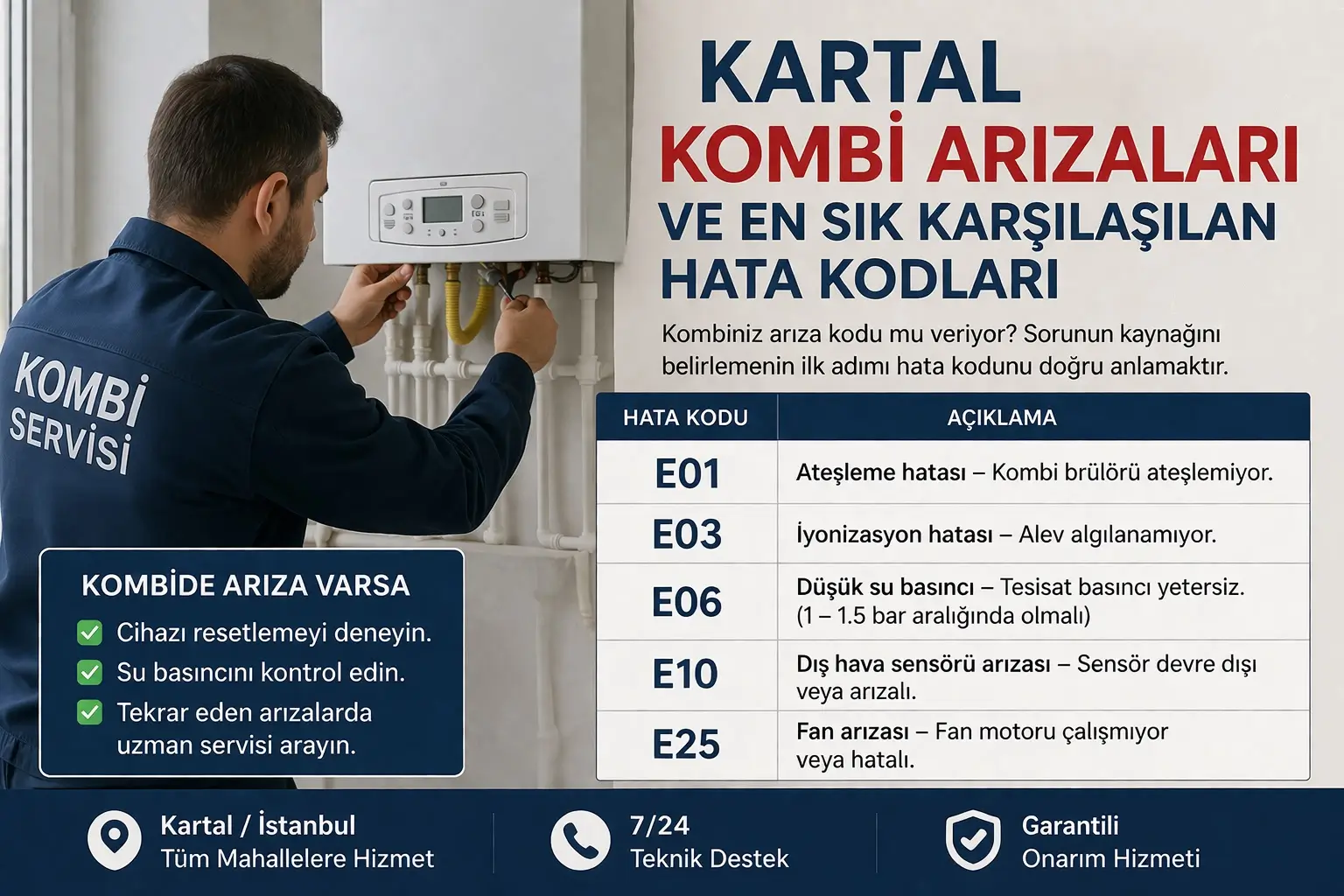 Kartal’da özellikle Soğanlık Orta Mahalle ve Petroliş Mahallesi gibi bölgelerde kombi basıncının düşmesi nedeniyle E10 hatasının sıkça görüldüğü servis kayıtlarına yansımaktadır.