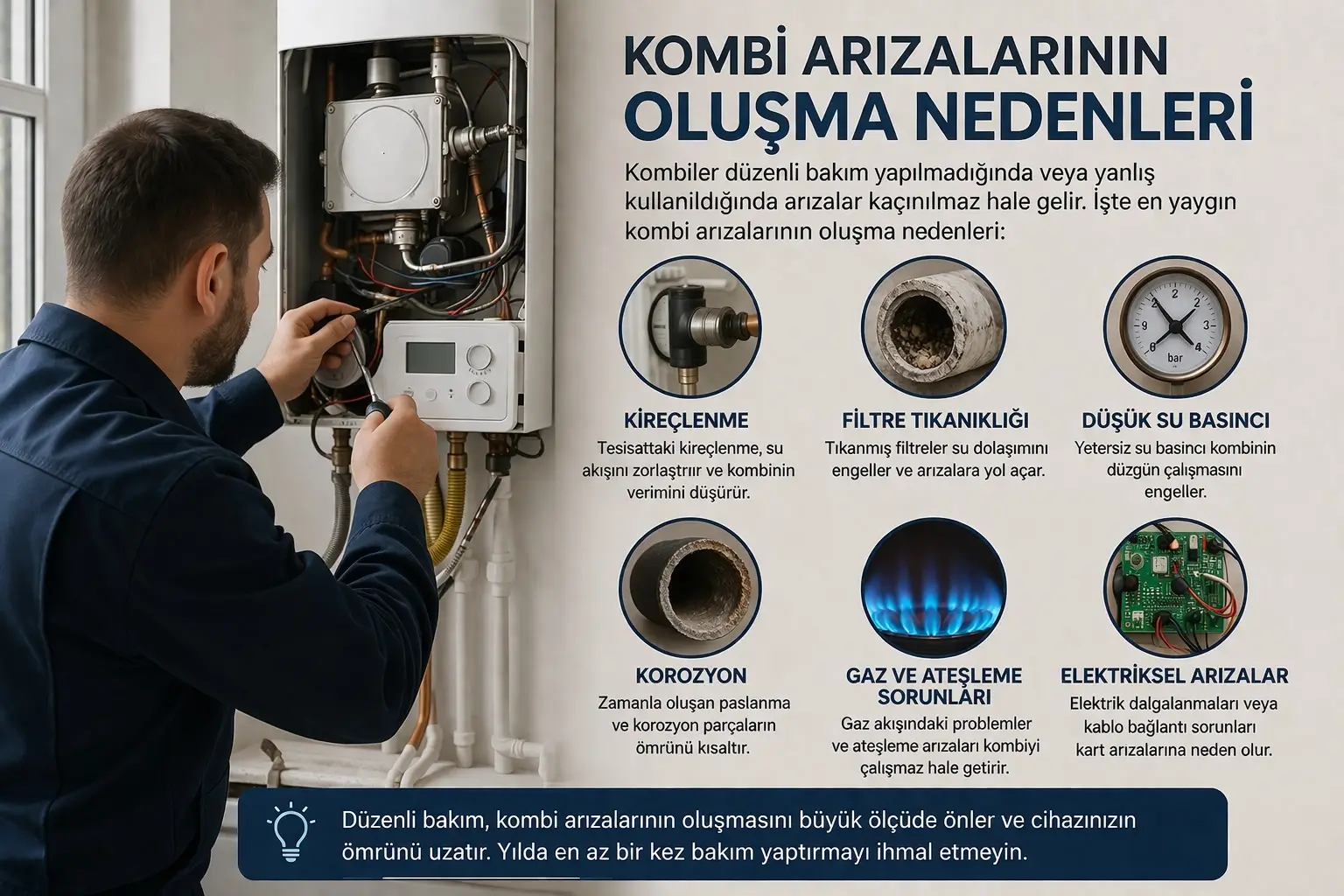 Düzenli kombi bakımı yapılmadığında yüksek doğalgaz tüketimi, düşük ısınma performansı, sıcak su problemleri ve beklenmeyen arızalar ortaya çıkabilmektedir.