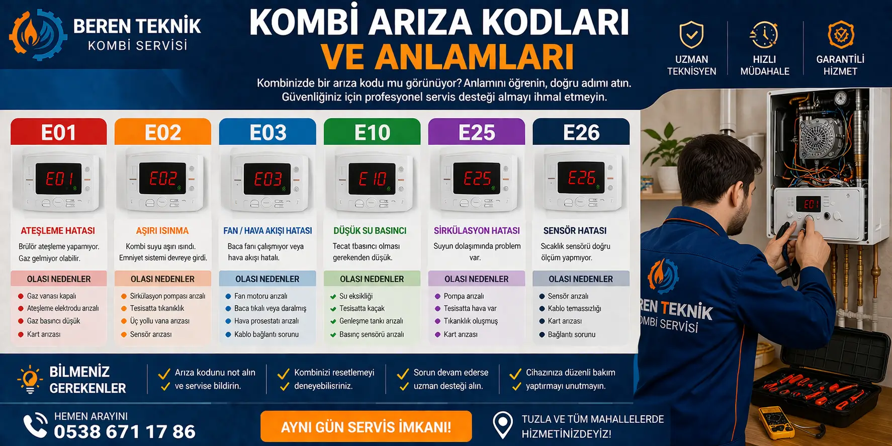 Kombi cihazlarında görülen hata kodlarının, arızanın kaynağı hakkında önemli ipuçları verdiği bilinmektedir.